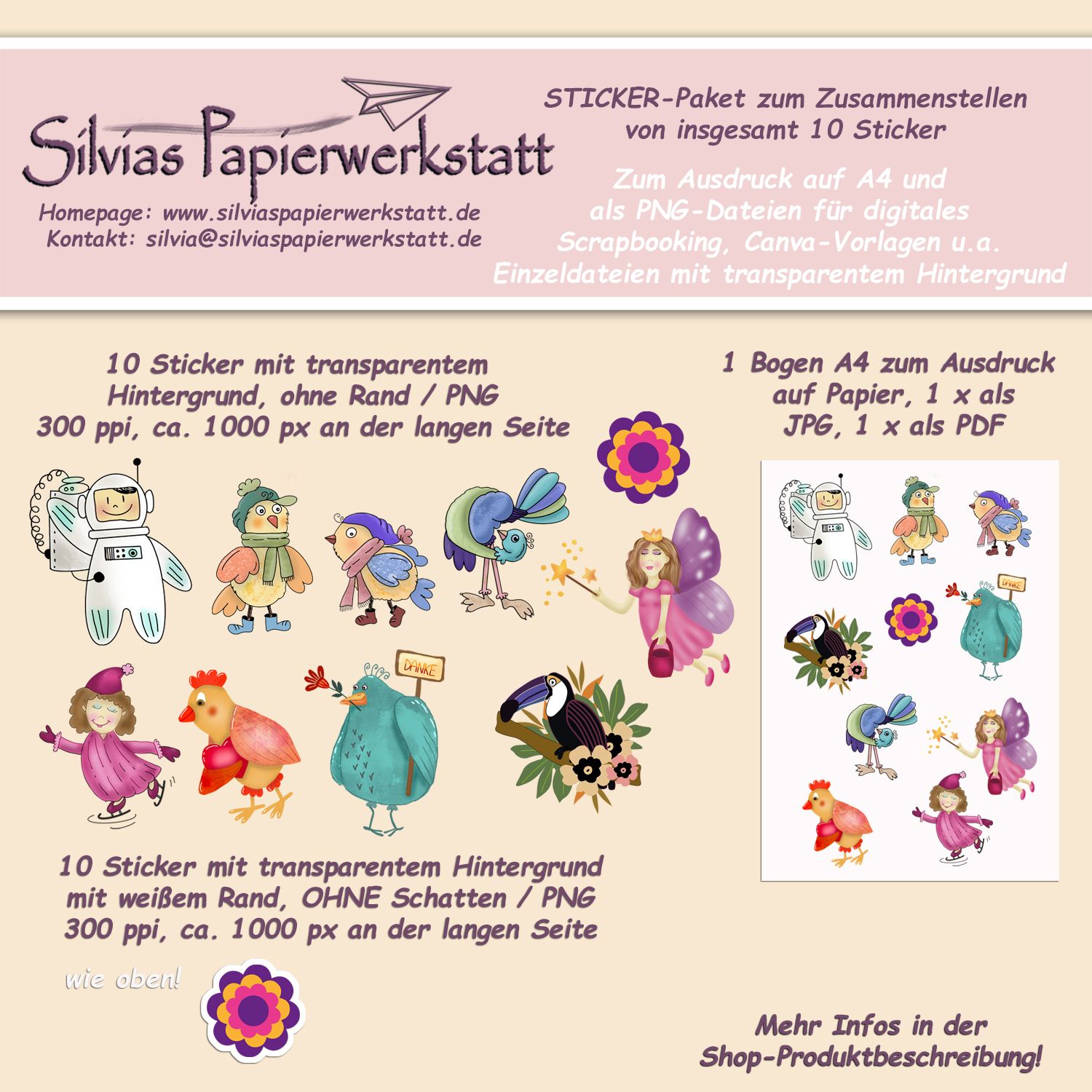 Außerdem diverse Endlosmuster und Sticker für digitales und analoges Scrapbooking, Kartengestaltung, Bullet-Journal, Canva-Vorlagen u.a. Projekte.