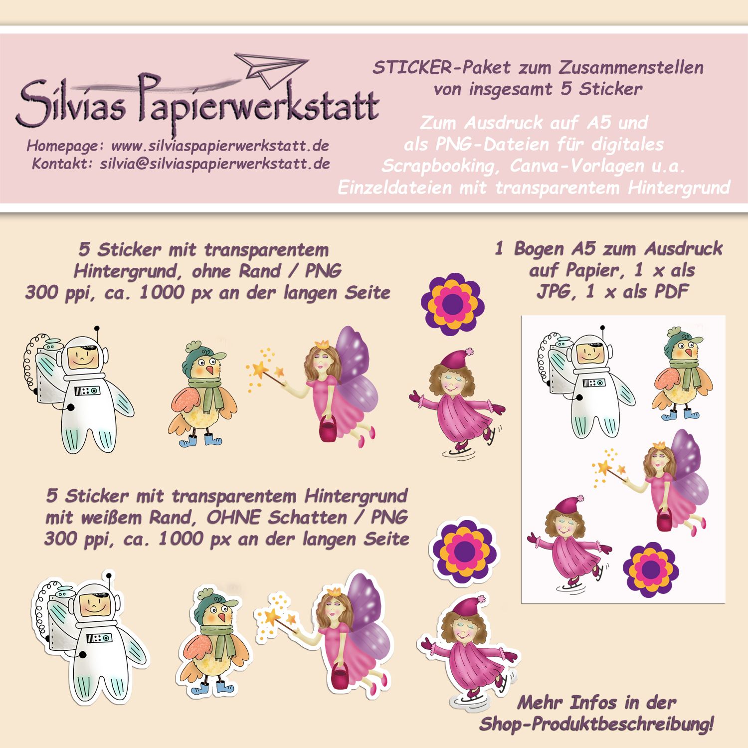 Außerdem diverse Endlosmuster und Sticker für digitales und analoges Scrapbooking, Kartengestaltung, Bullet-Journal, Canva-Vorlagen u.a. Projekte.