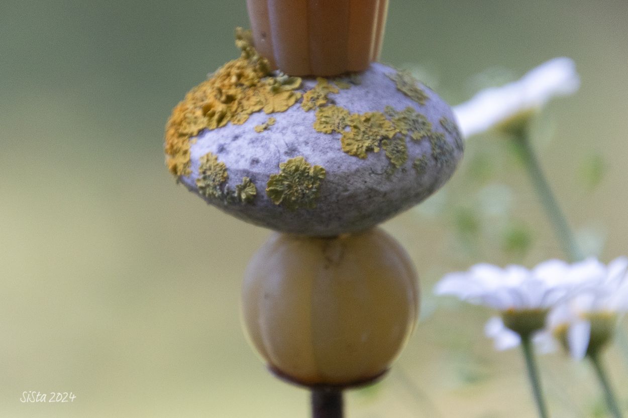 Der mit Moos bewachsene Pflanzstab und die Margeriten im Hintergrund haben bestimmt auch eine Geschichte zu erzählen. Alles verändert sich. Nichts bleibt, wie es ist .....